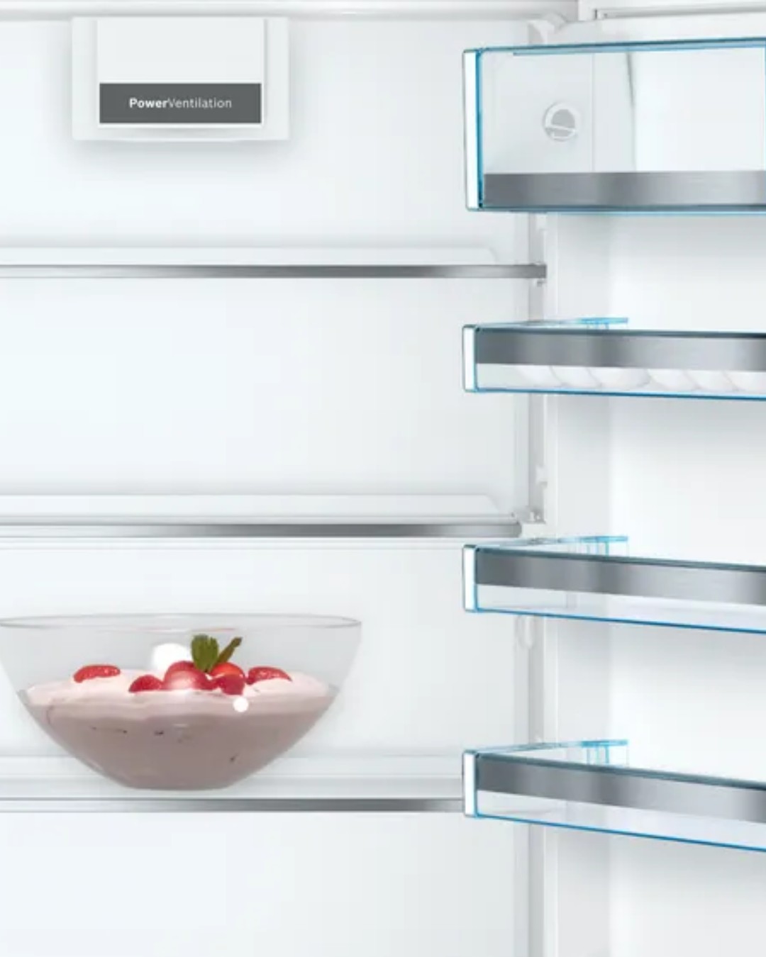 Gracias a la bandeja deslizante Vario de nuestros frigoríficos integrables podrás adaptarla a tus necesidades con un simple movimiento. Desliza la parte delantera hacia abajo y obtendrás un mauor espacio, ideal para almacenar botellas altas o recipientes de mayor tamaño.