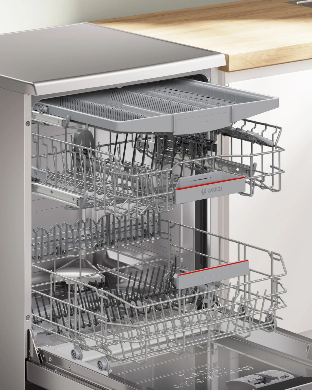 Cesta superior RackMatic 3 niveles puedes regular con absoluta seguridad la altura de la cesta superior hasta 5 cm en 3 niveles diferentes, incluso con la cesta llena.